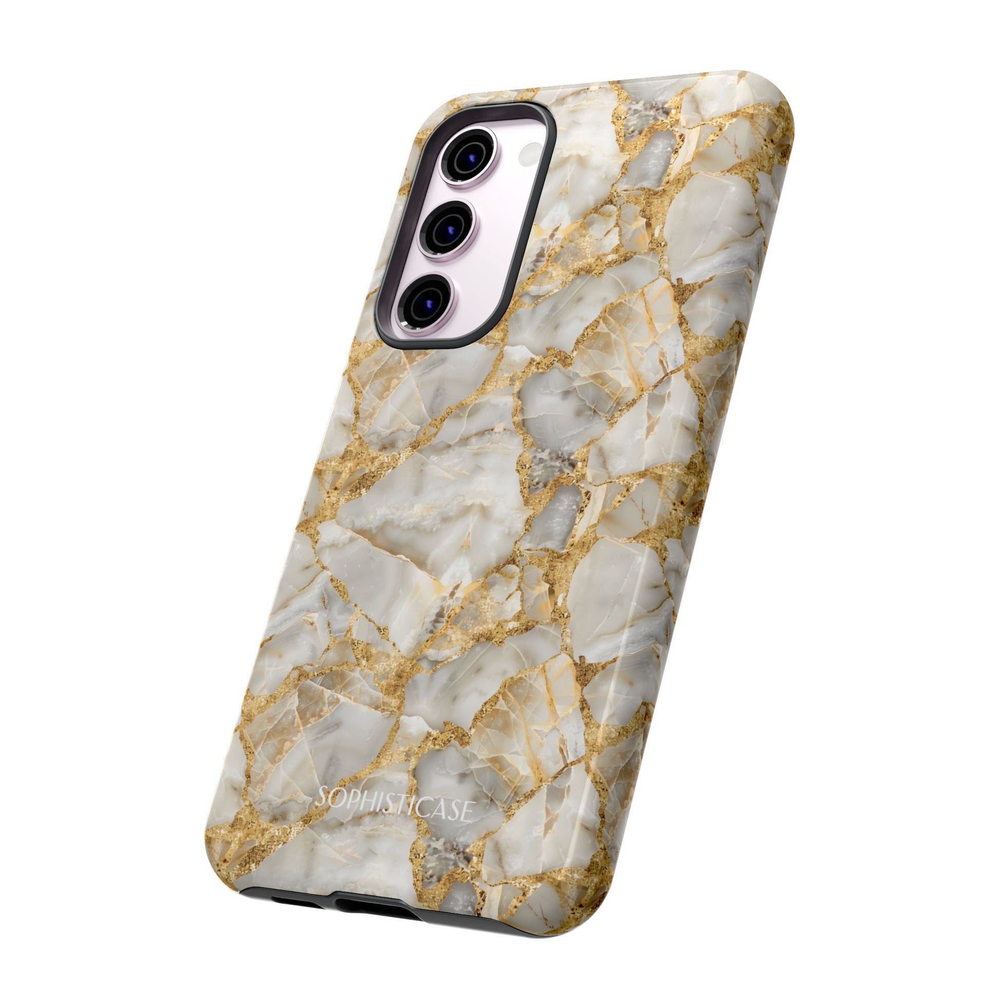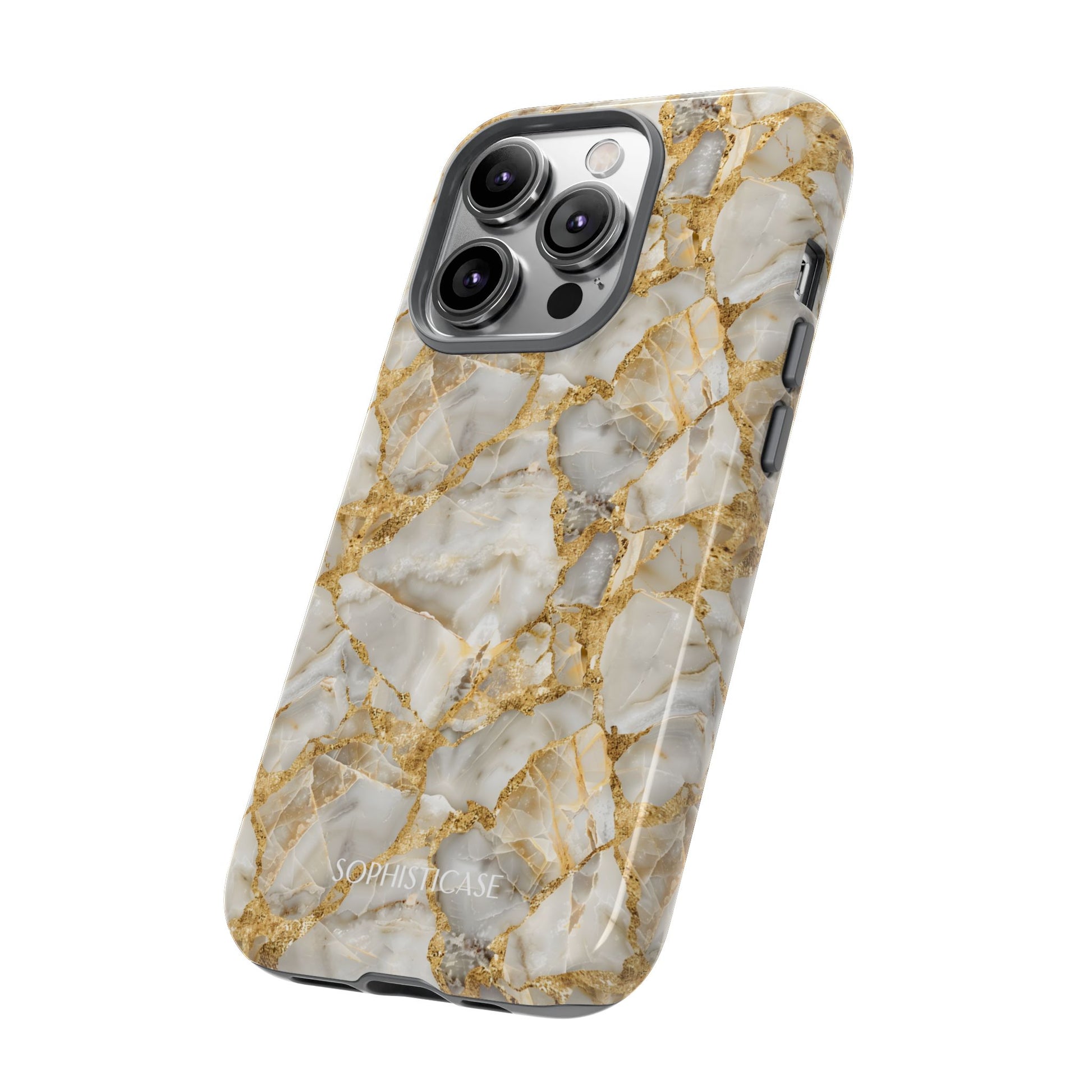 • HD print: a glossy marble stone look design with golden-toned accents.