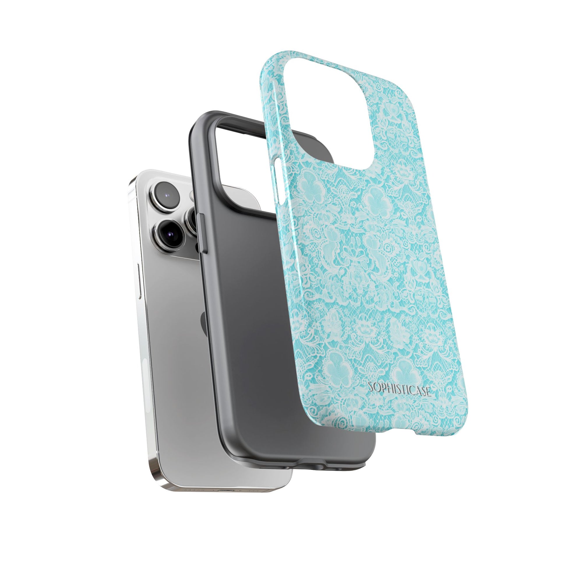 Our Luxe Lace iPhone case in aqua, perfect for the lady looking for an aesthetic lace print and every day durability. Our tough cases provide superior 12ft drop protection for your phone with a durable outer shell and a shock absorbing inner liner, keeping your phone safe from drops and bumps. It's giving everything you need; vintage lace aesthetic with everyday strength. ✨