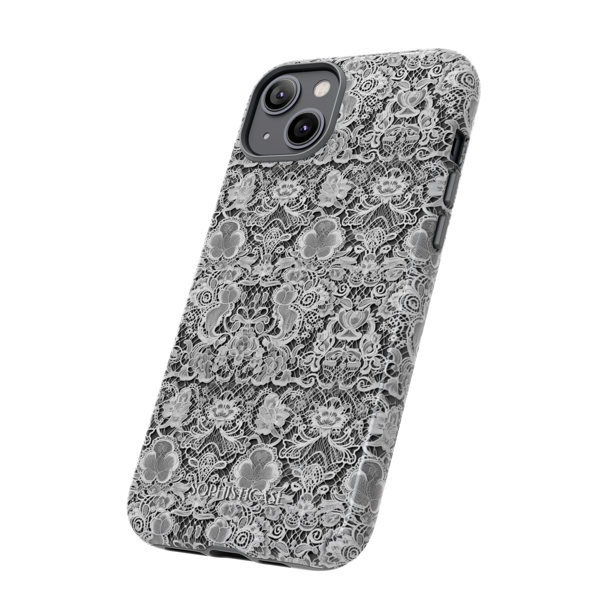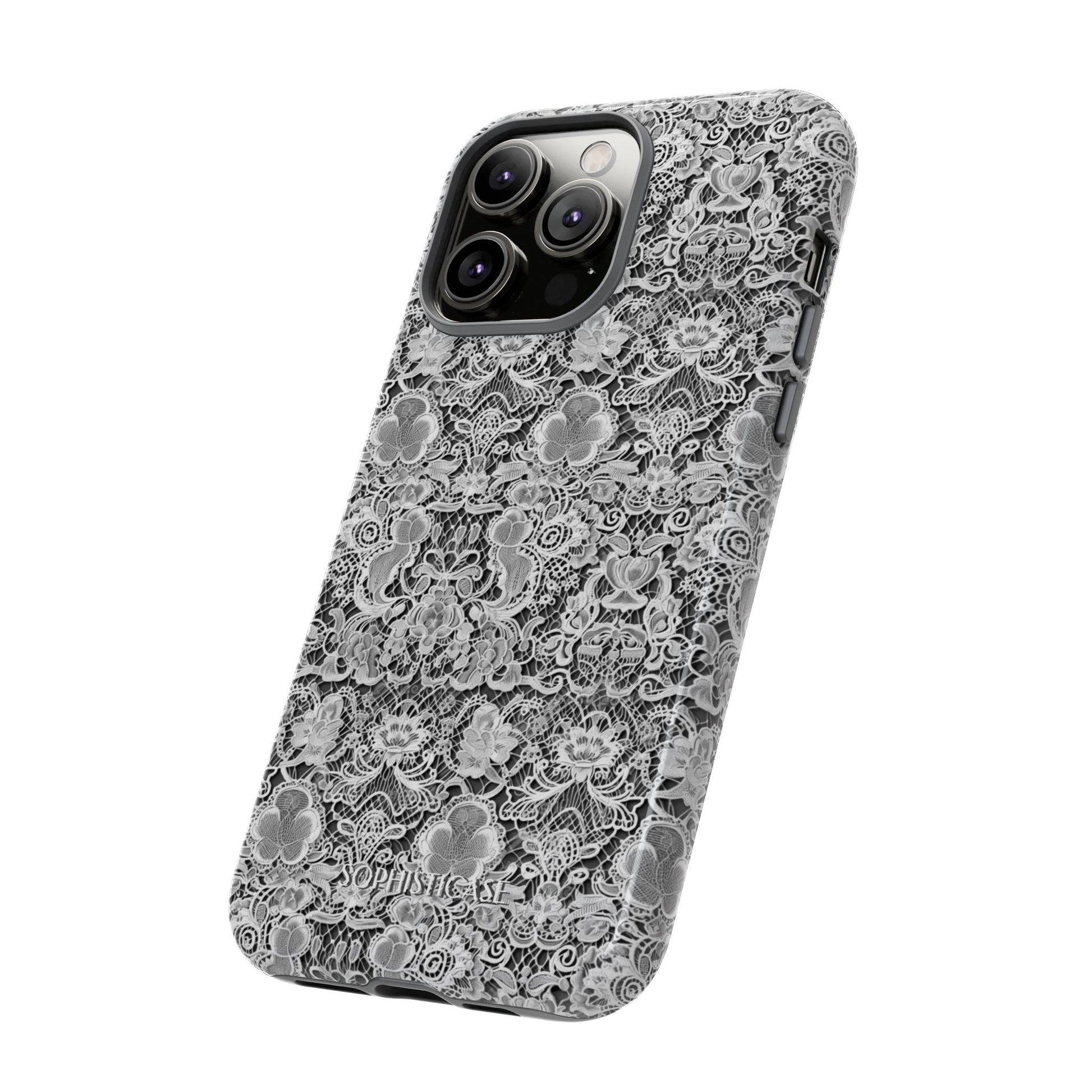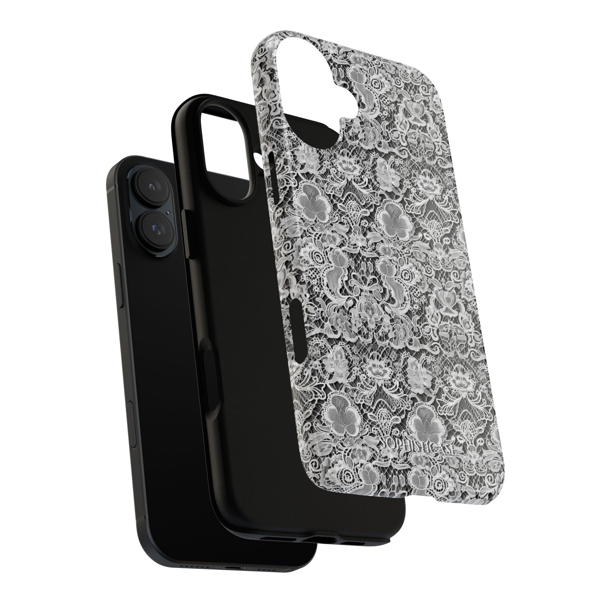Our Luxe Lace iPhone case in black, perfect for the lady looking for an aesthetic lace print and every day durability. Our tough cases provide superior 12ft drop protection for your phone with a durable outer shell and a shock absorbing inner liner, keeping your phone safe from drops and bumps. It's giving everything you need; vintage lace aesthetic with everyday strength. ✨