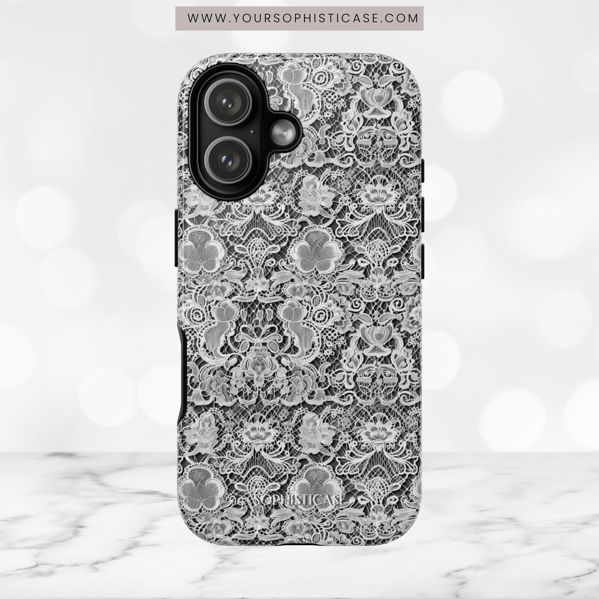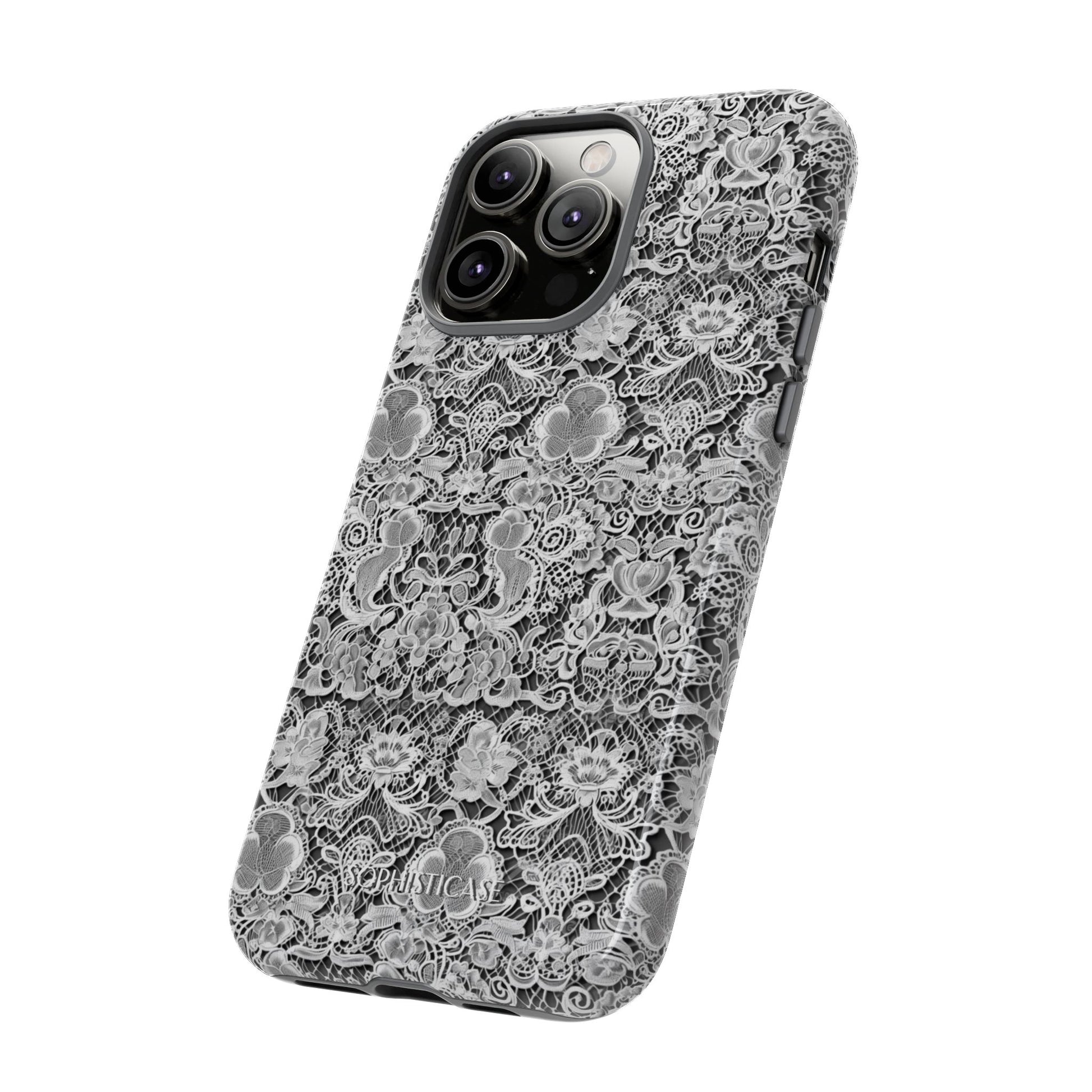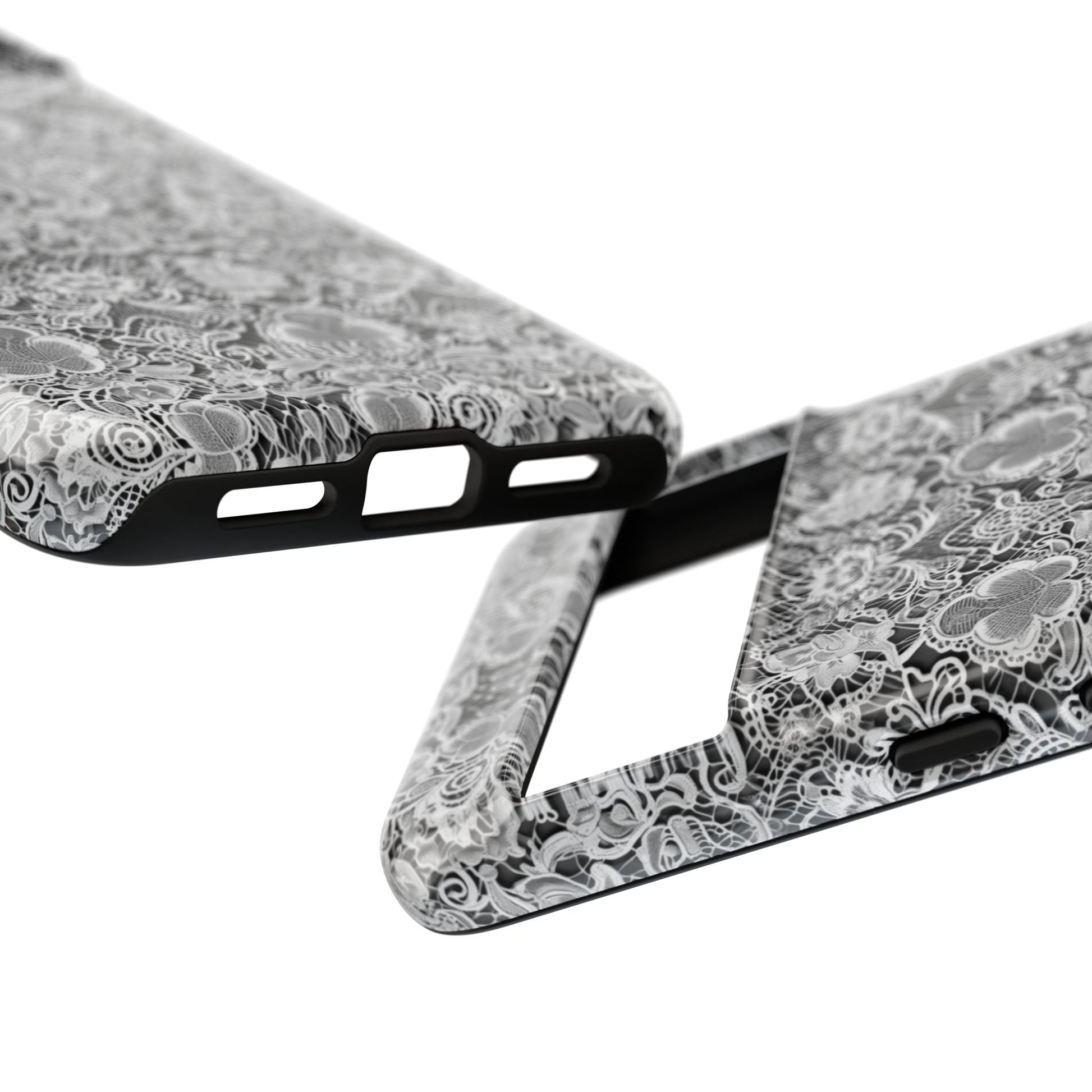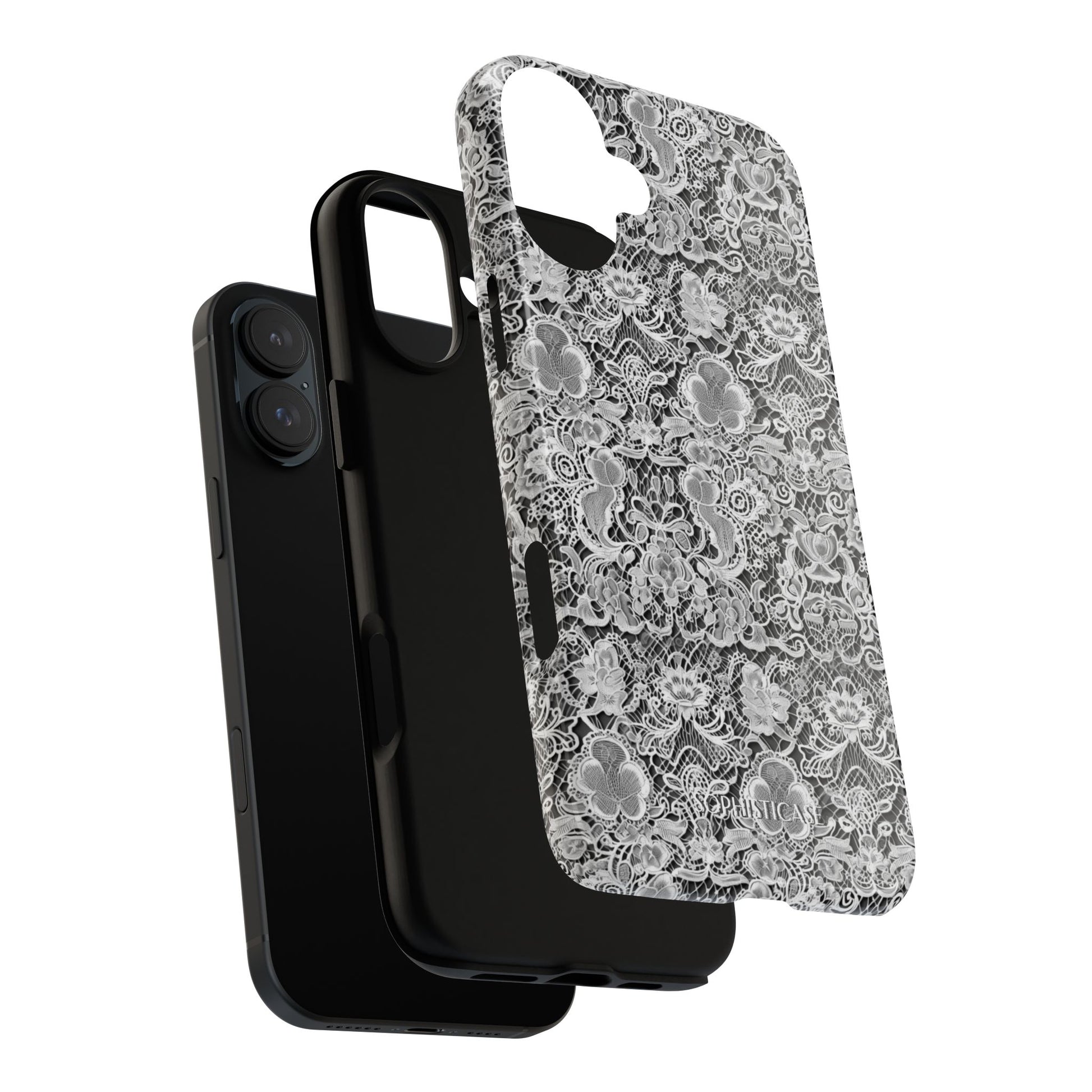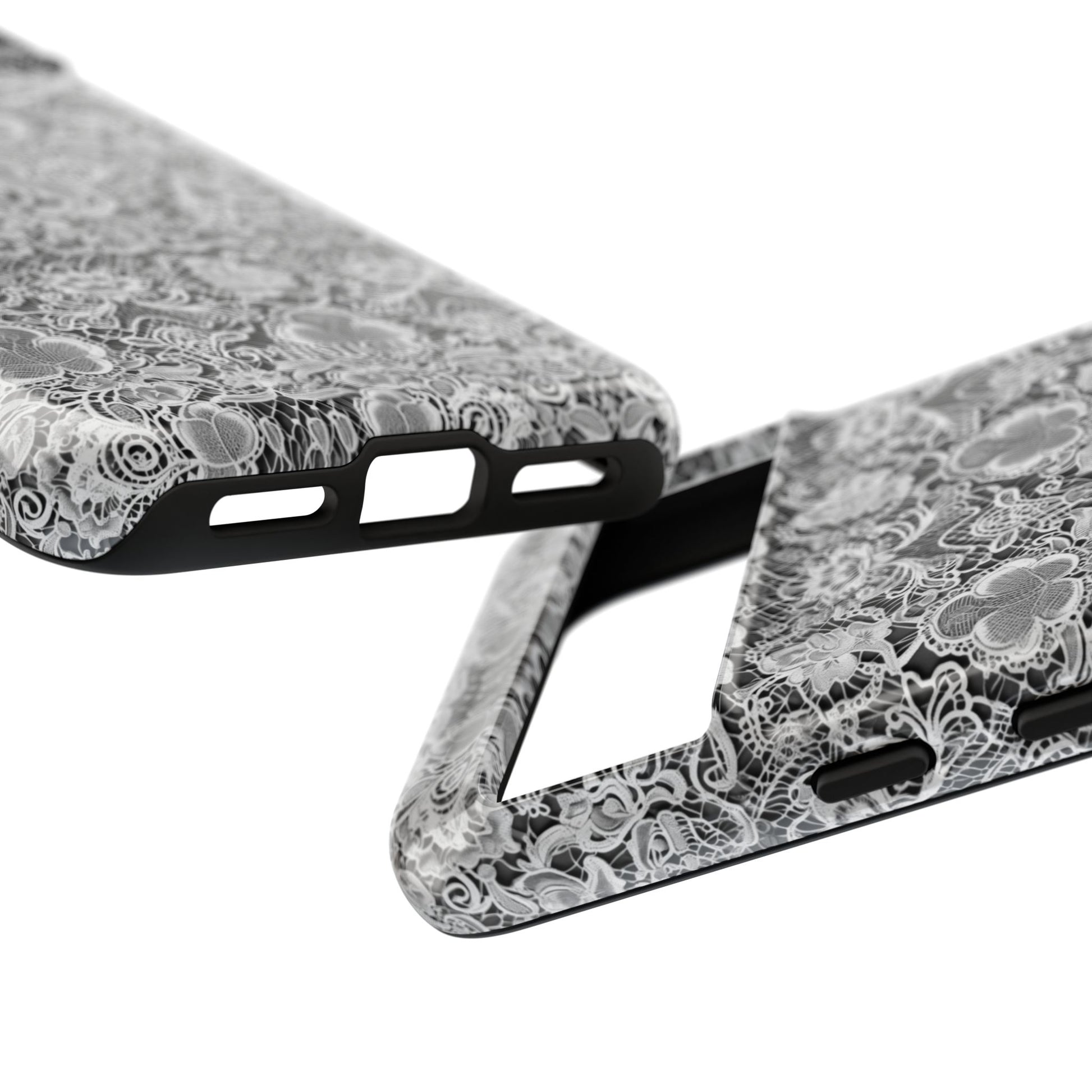 Our Luxe Lace tough case in black, perfect for the lady looking for an aesthetic lace print and every day durability. Our tough cases provide superior 6ft drop protection for your phone with a durable outer shell and a shock absorbing inner liner, keeping your phone safe from drops and bumps. It's giving everything you need; vintage lace aesthetic with everyday strength. ✨