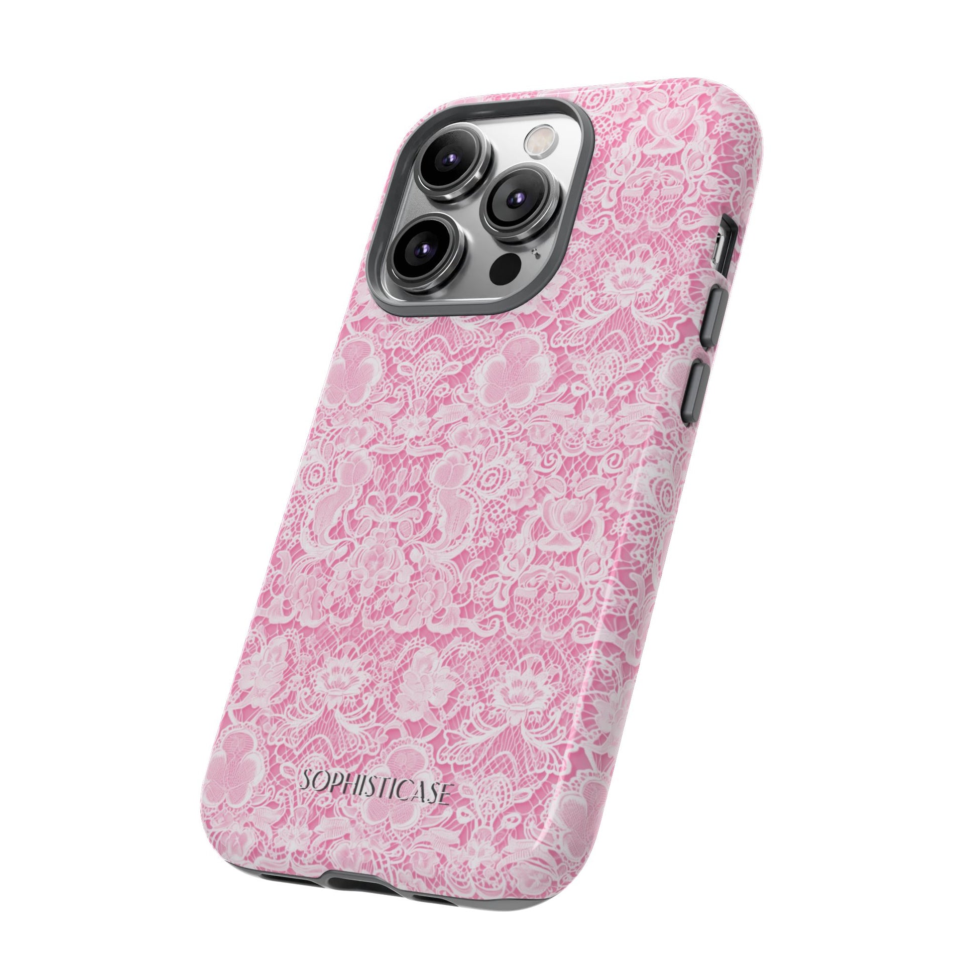 Our Luxe Lace tough case in pink, perfect for the lady looking for an aesthetic lace print and every day durability. Our tough cases provide superior 6ft drop protection for your phone with a durable outer shell and a shock absorbing inner liner, keeping your phone safe from drops and bumps. It's giving everything you need; vintage lace aesthetic with everyday strength. ✨