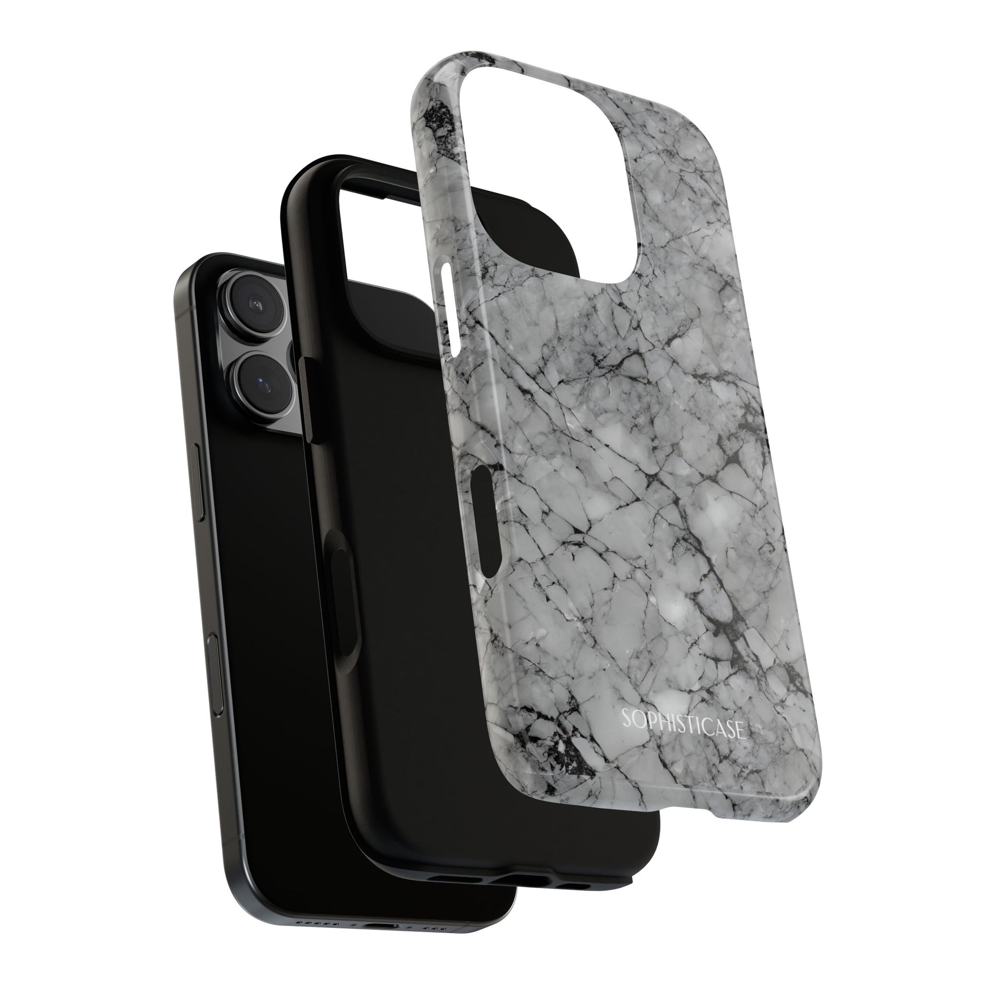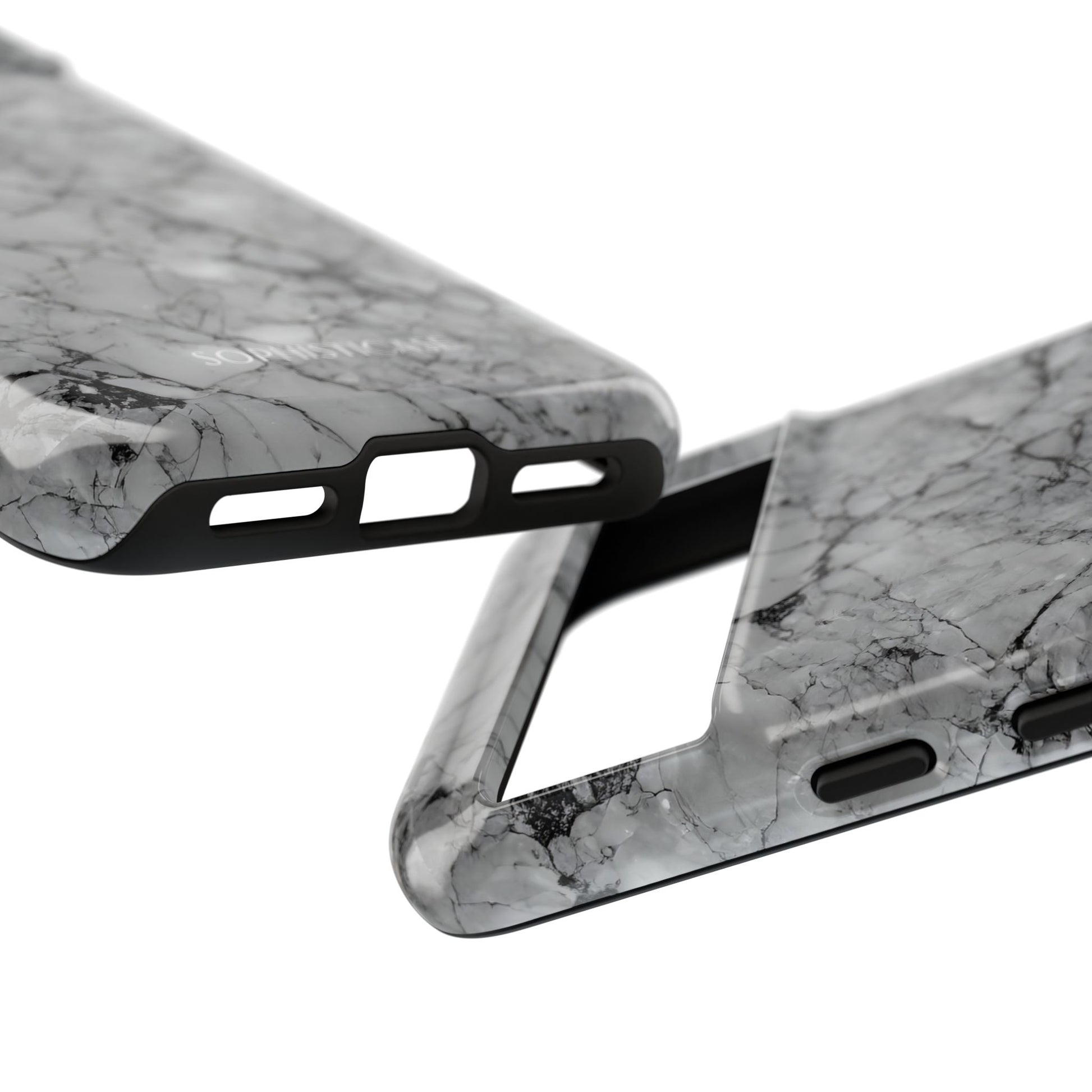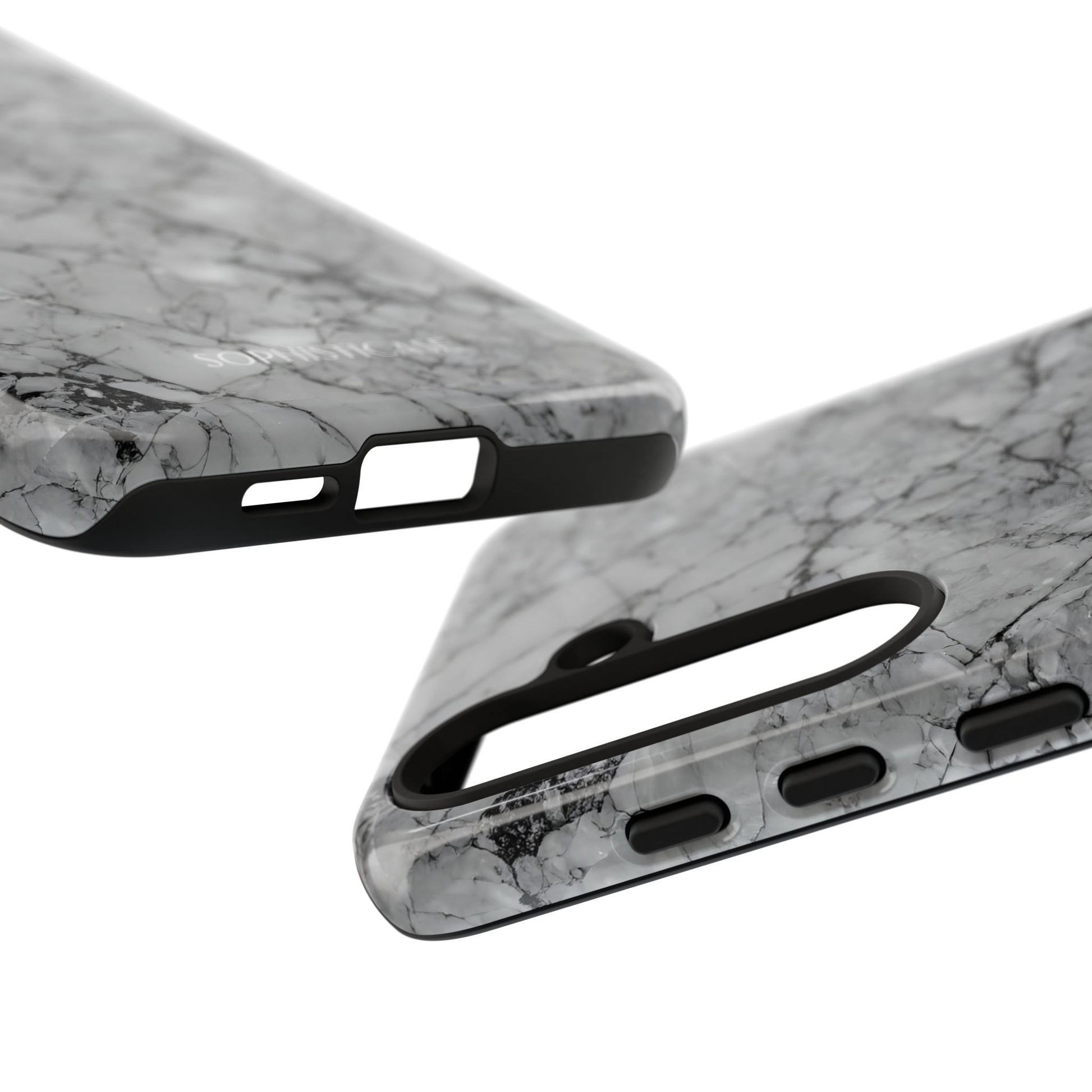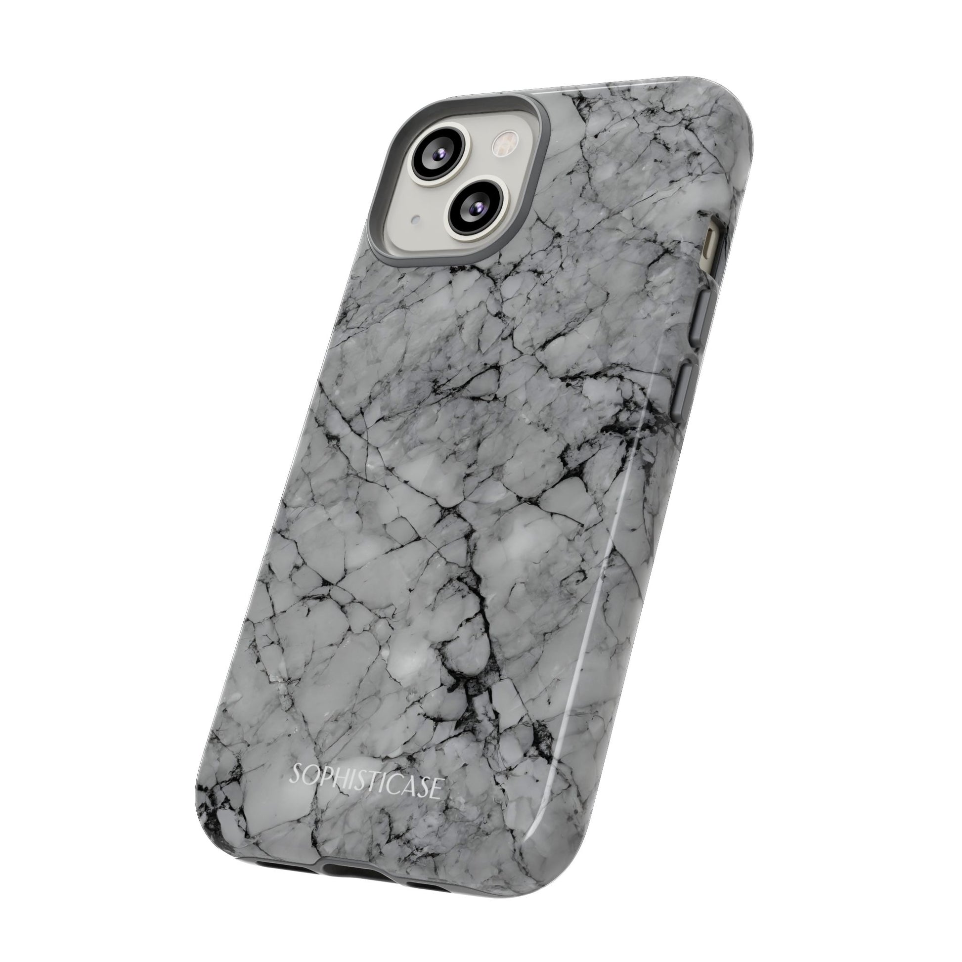 Your new everyday essential: Our Marble Opulence phone case in grey transforms your device into a statement of refined taste. Perfect for the woman who appreciates the finer things and isn't afraid to show it. Our tough cases provide superior 12ft drop protection for your phone with a durable outer shell and shock absorbing inner liner, keeping your phone safe from drops and bumps. Its giving everything you need - luxurious style with reliable protection.Â