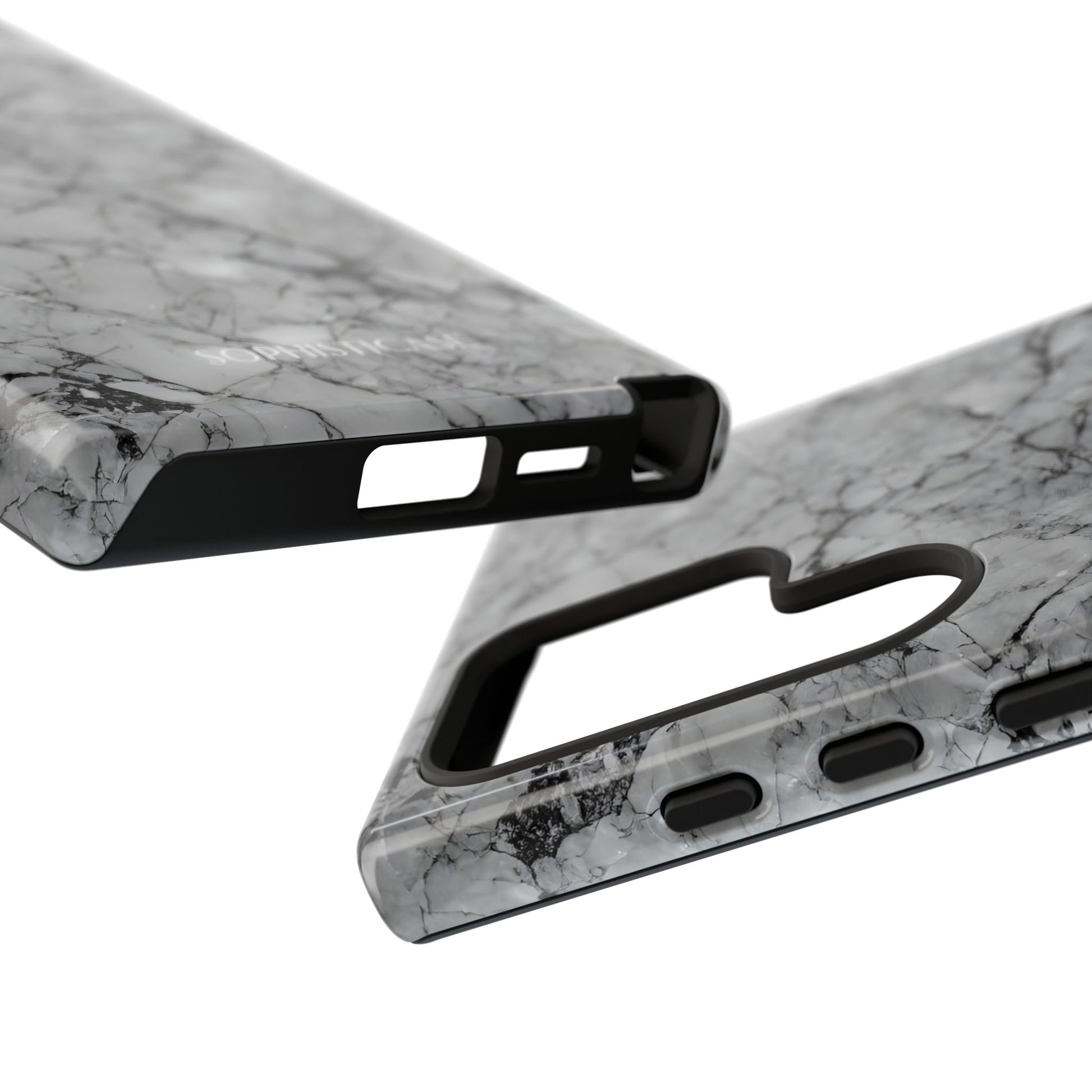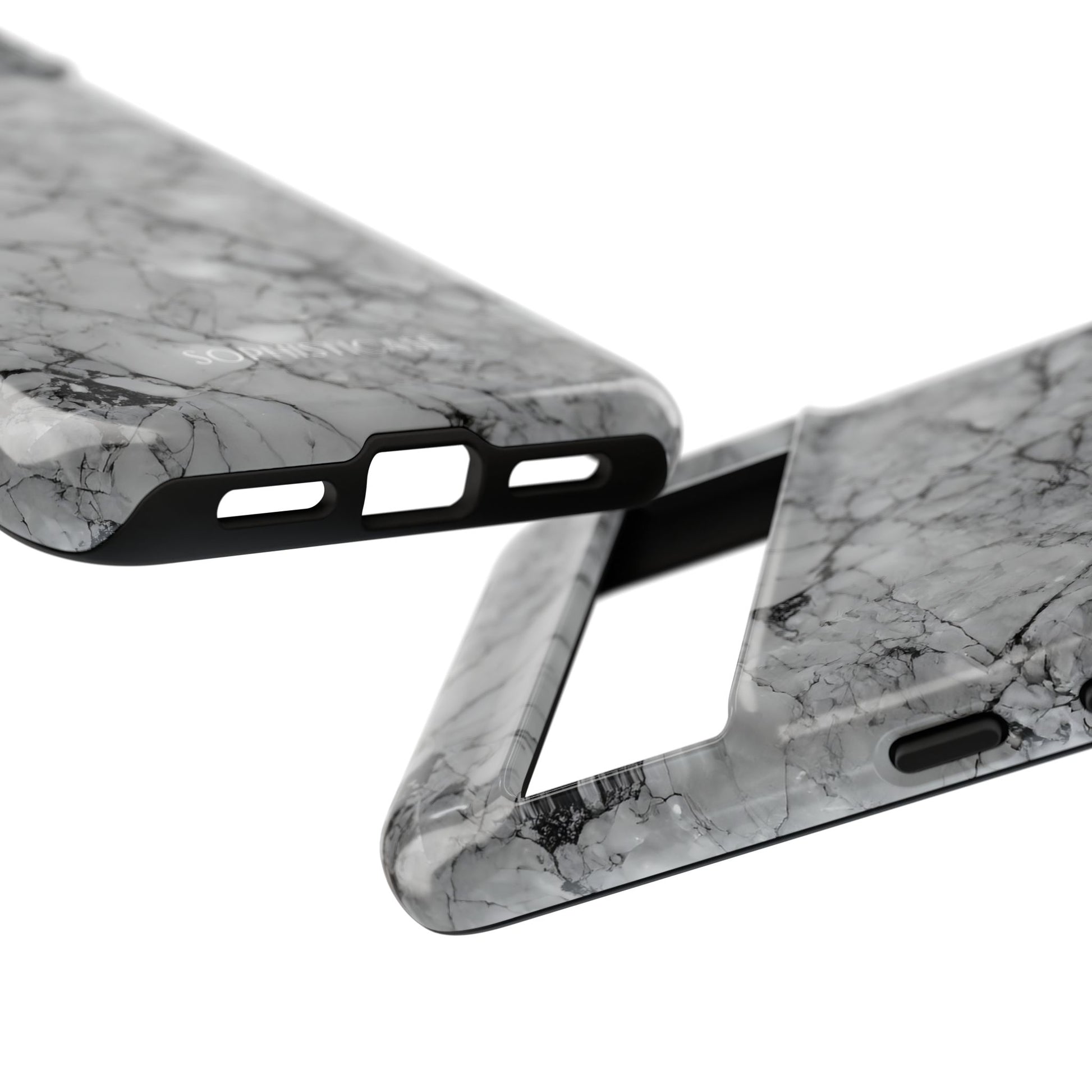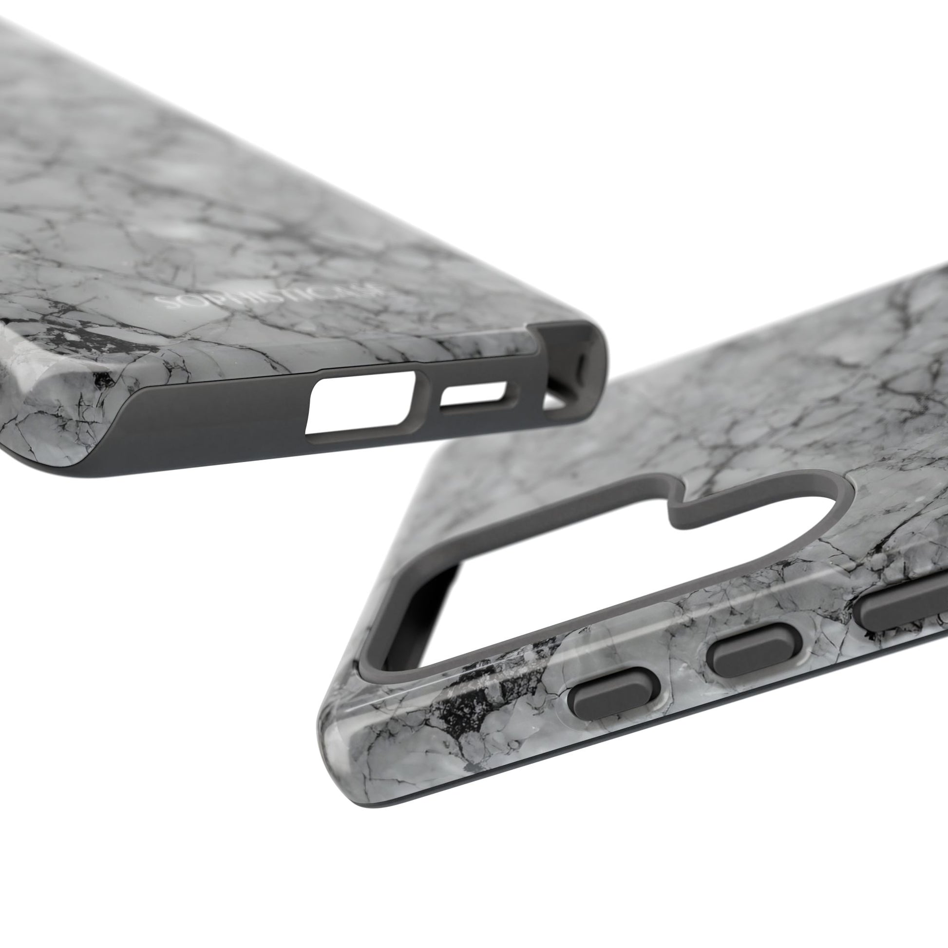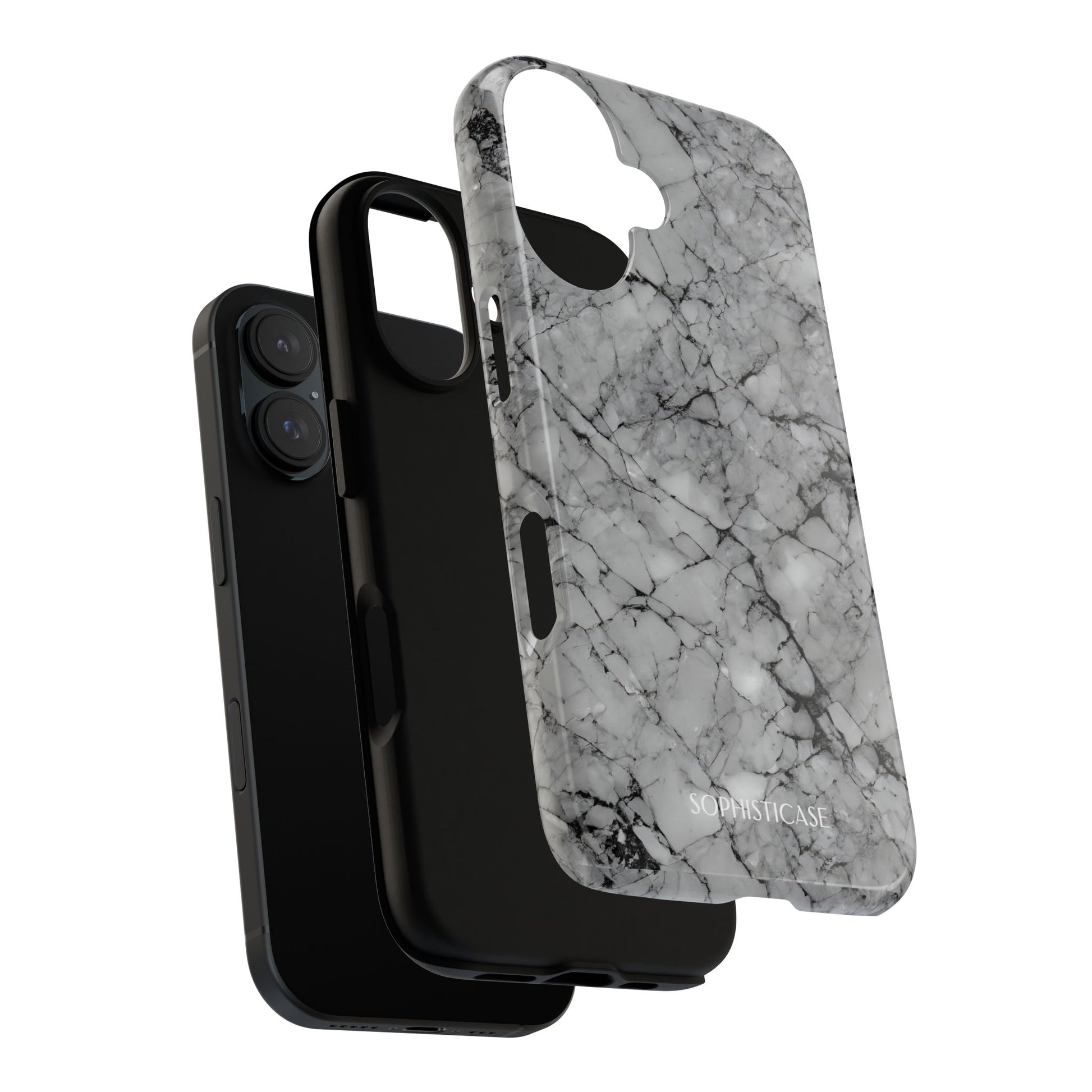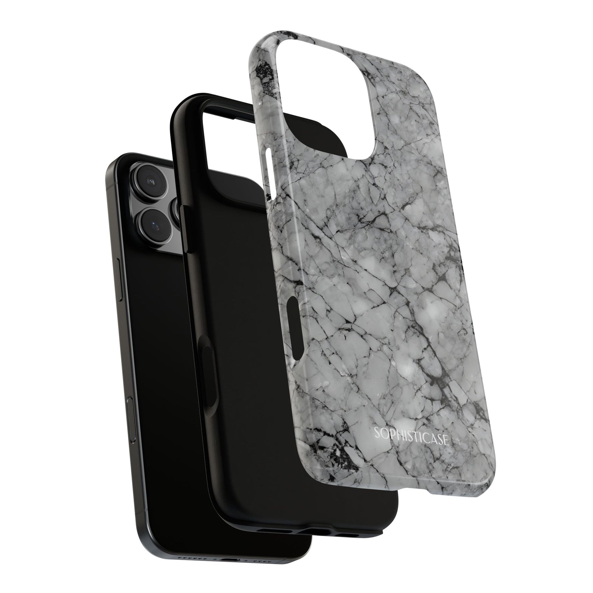 Your new everyday essential: Our Marble Opulence phone case in grey transforms your device into a statement of refined taste. Perfect for the woman who appreciates the finer things and isn't afraid to show it. Our tough cases provide superior 12ft drop protection for your phone with a durable outer shell and shock absorbing inner liner, keeping your phone safe from drops and bumps. Its giving everything you need - luxurious style with reliable protection.Â