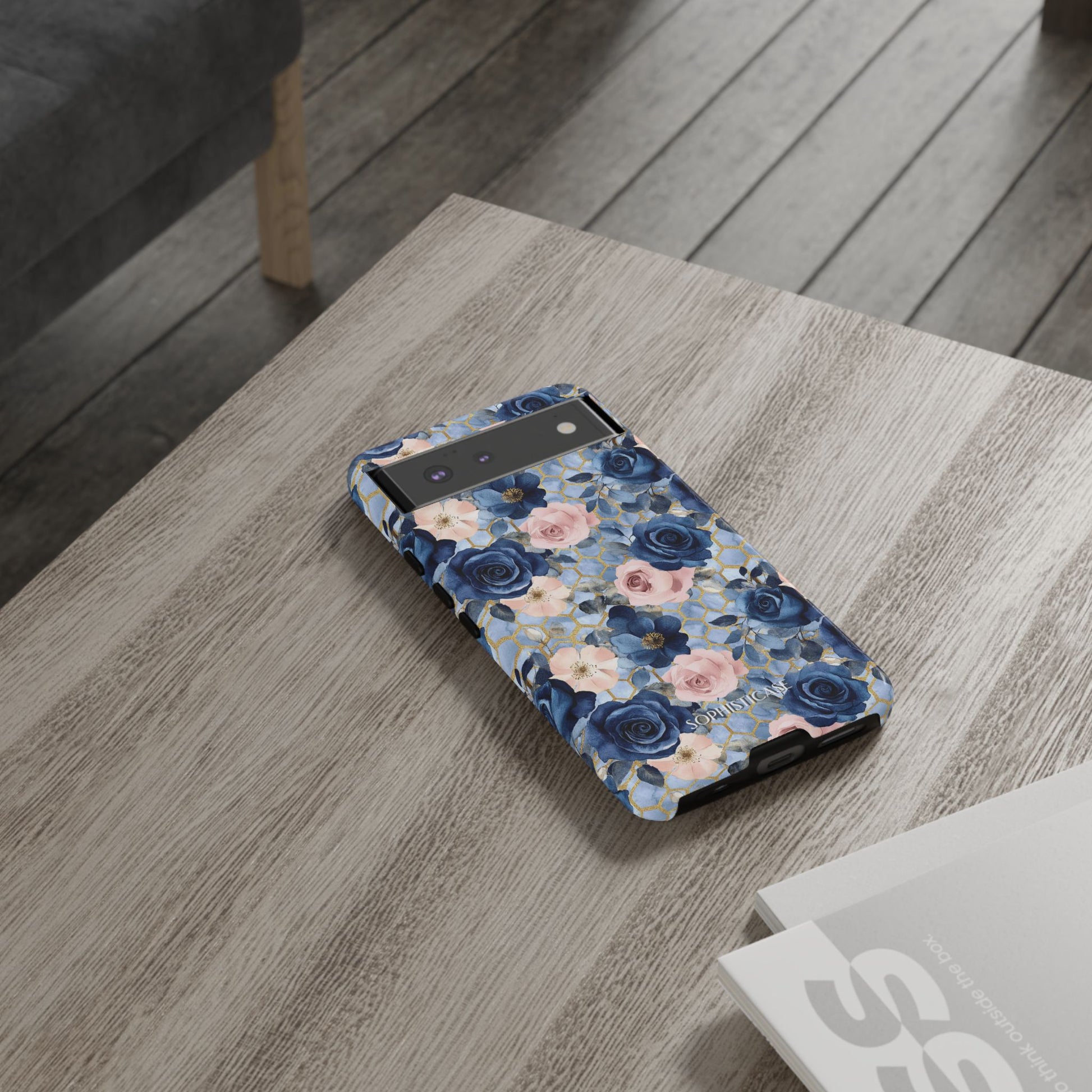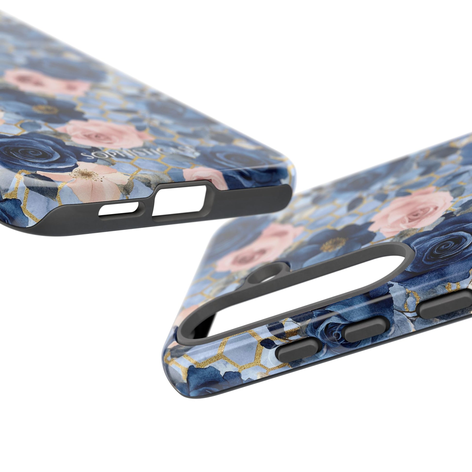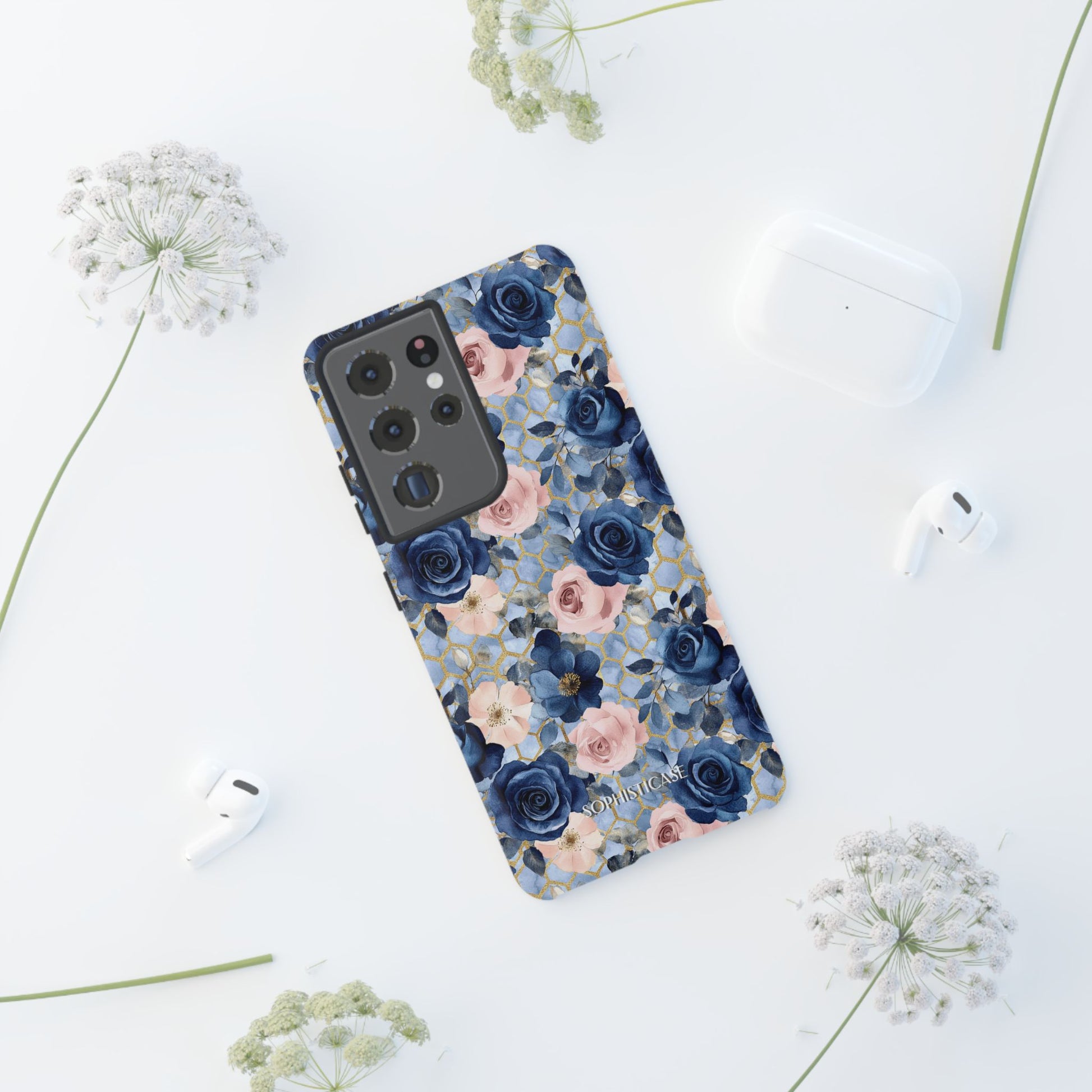 For the woman that turns every day into an entrance. Royal floral blooms and metallic look geometry give a refined, regal edge. Choose your mood and match your accessories: soft blush and mauve roses over marble geometric designs, or midnight navy blooms with shades of gold lattice. Its the statement case that works as hard as you do✨