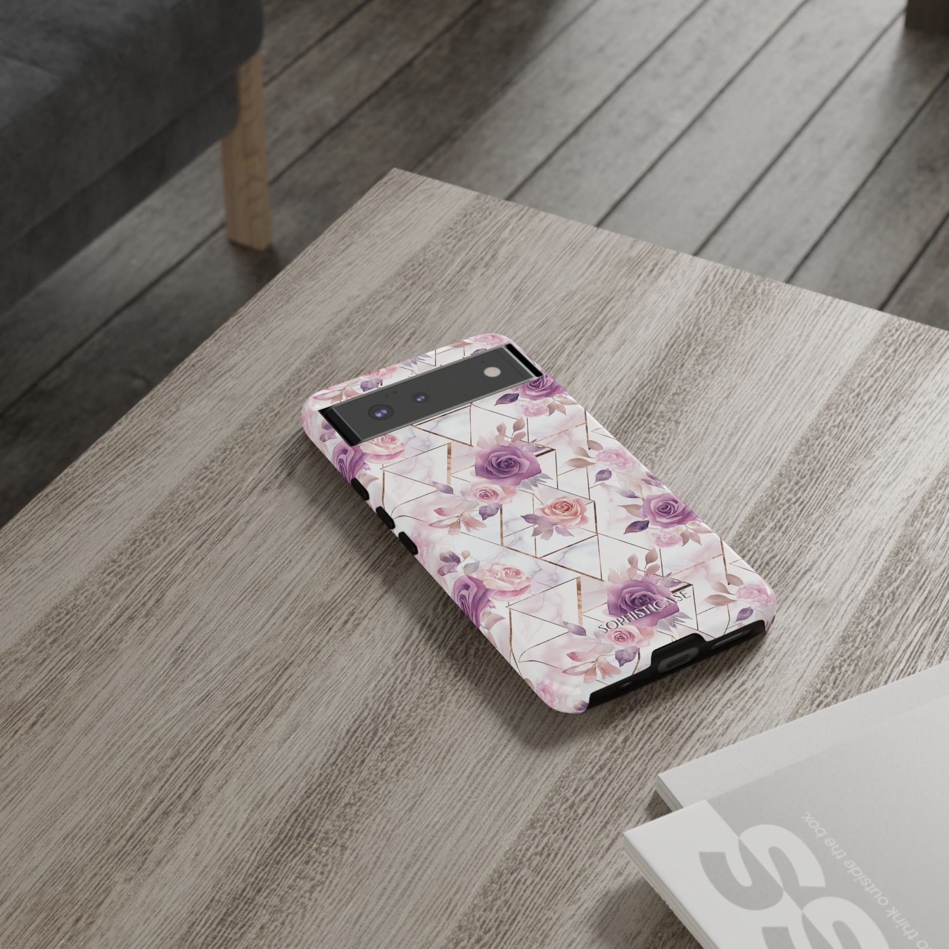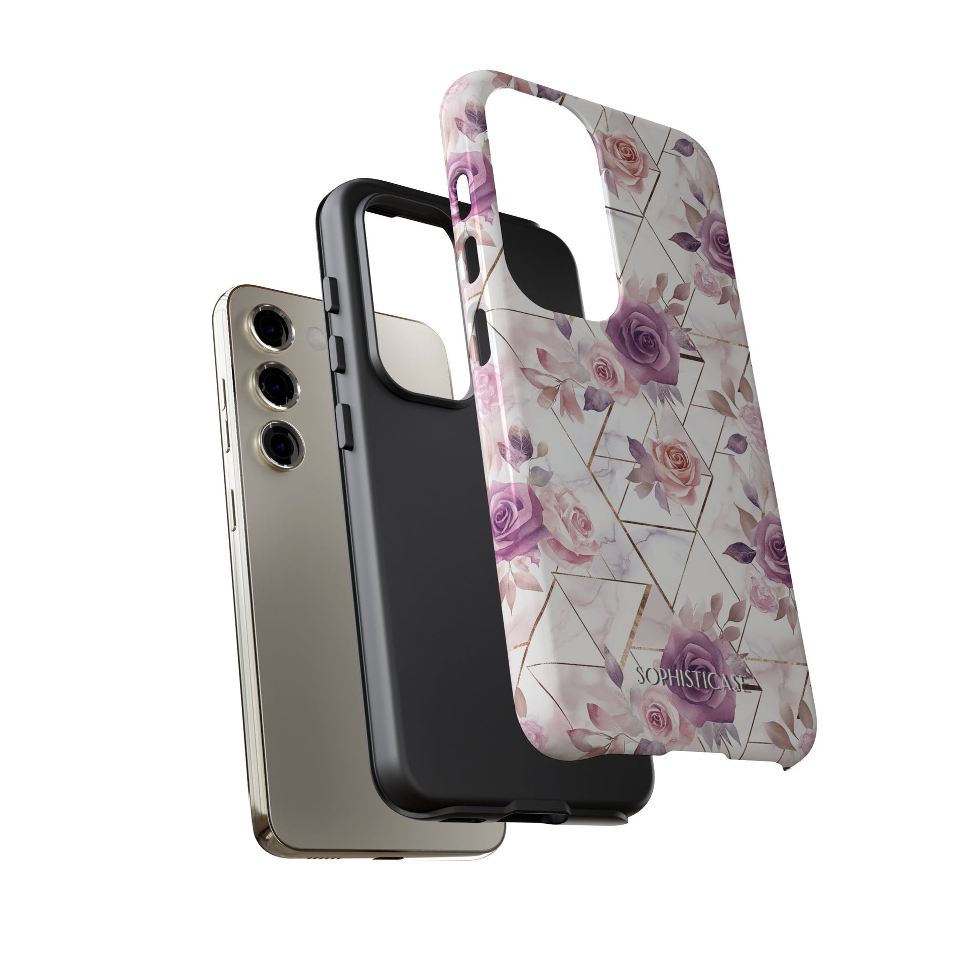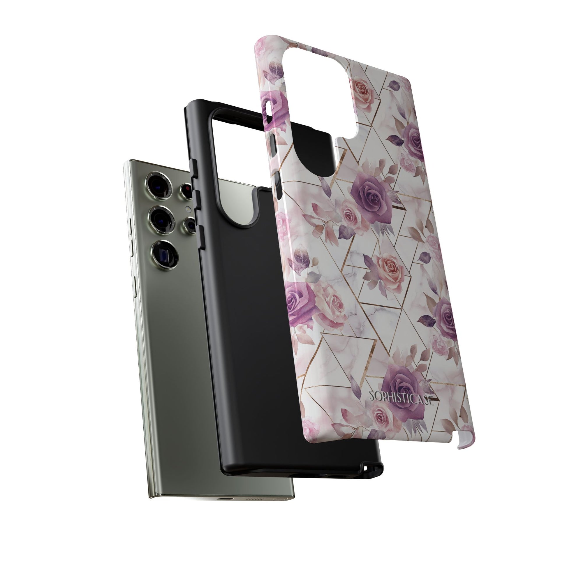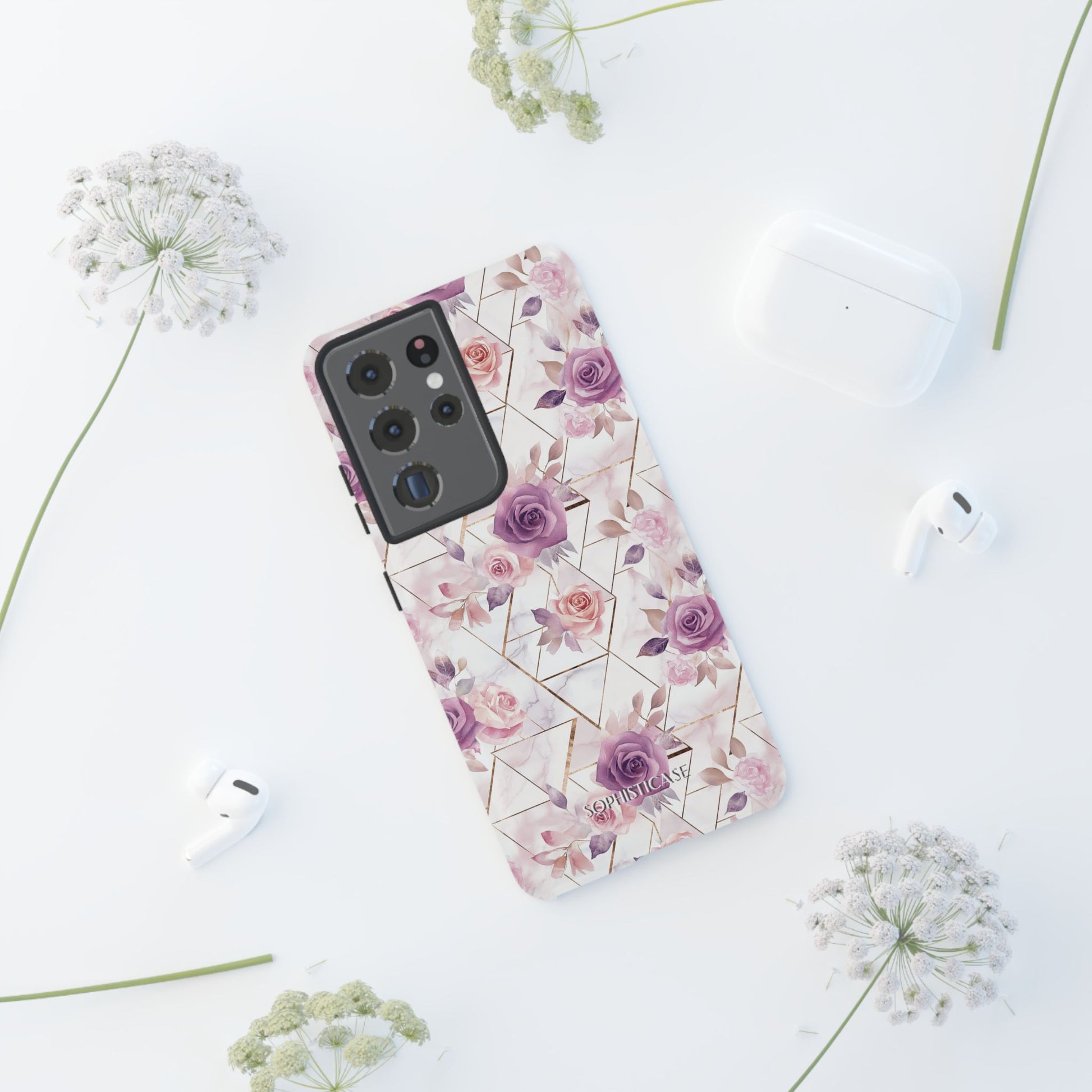For the woman that turns every day into an entrance. Royal floral blooms and metallic look geometry give a refined, regal edge. Choose your mood and match your accessories: soft blush and mauve roses over marble geometric designs, or midnight navy blooms with shades of gold lattice. Its the statement case that works as hard as you do✨