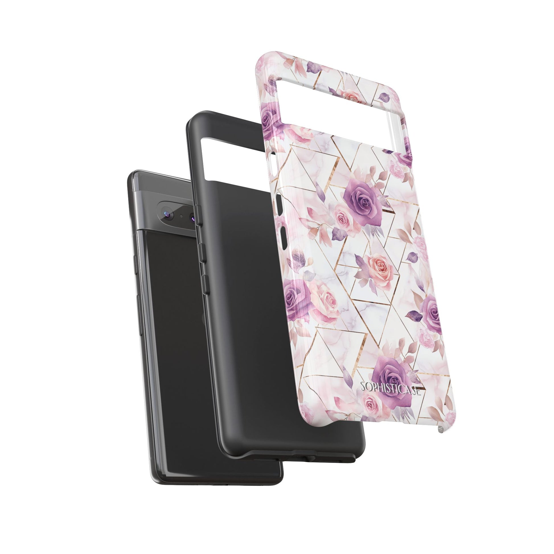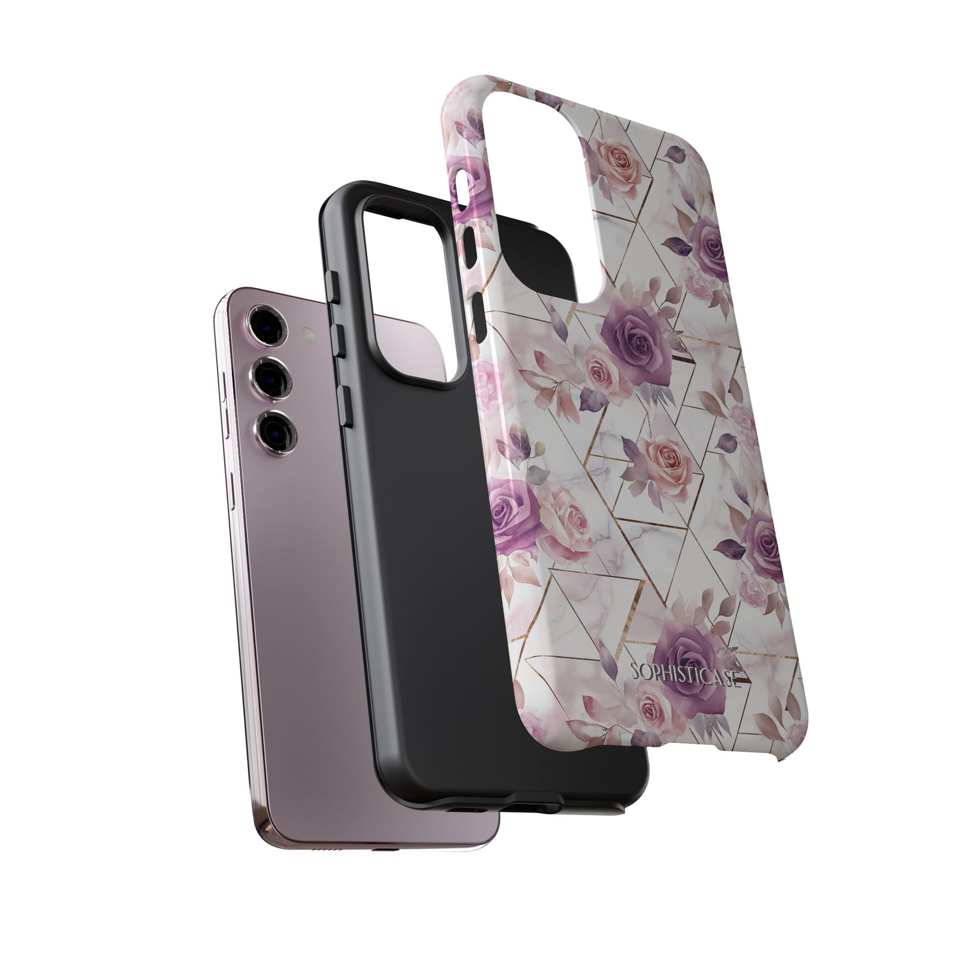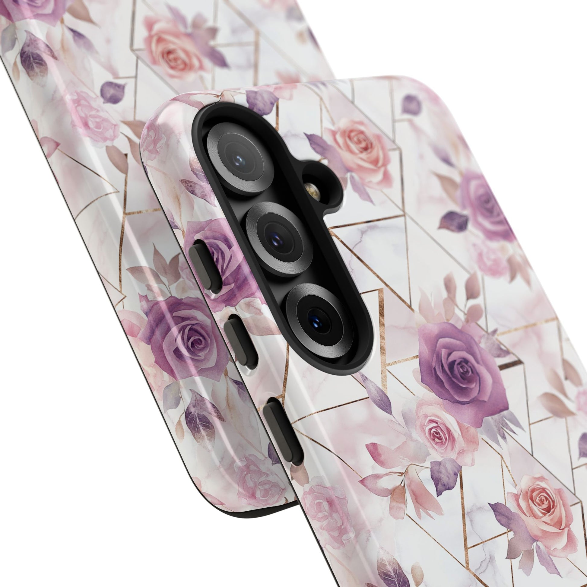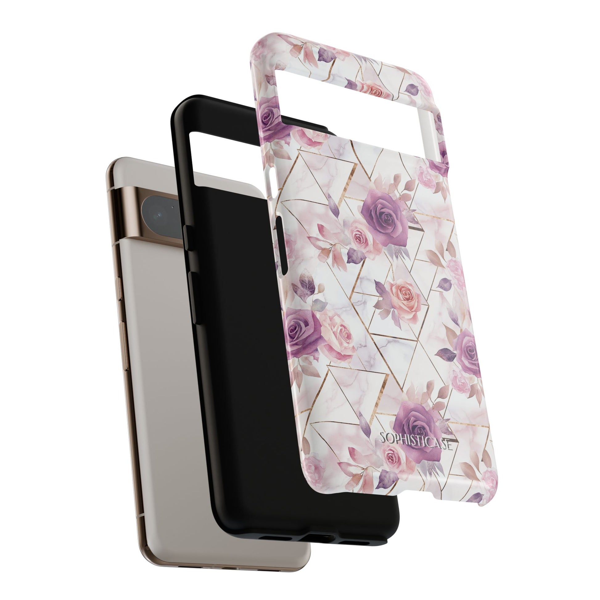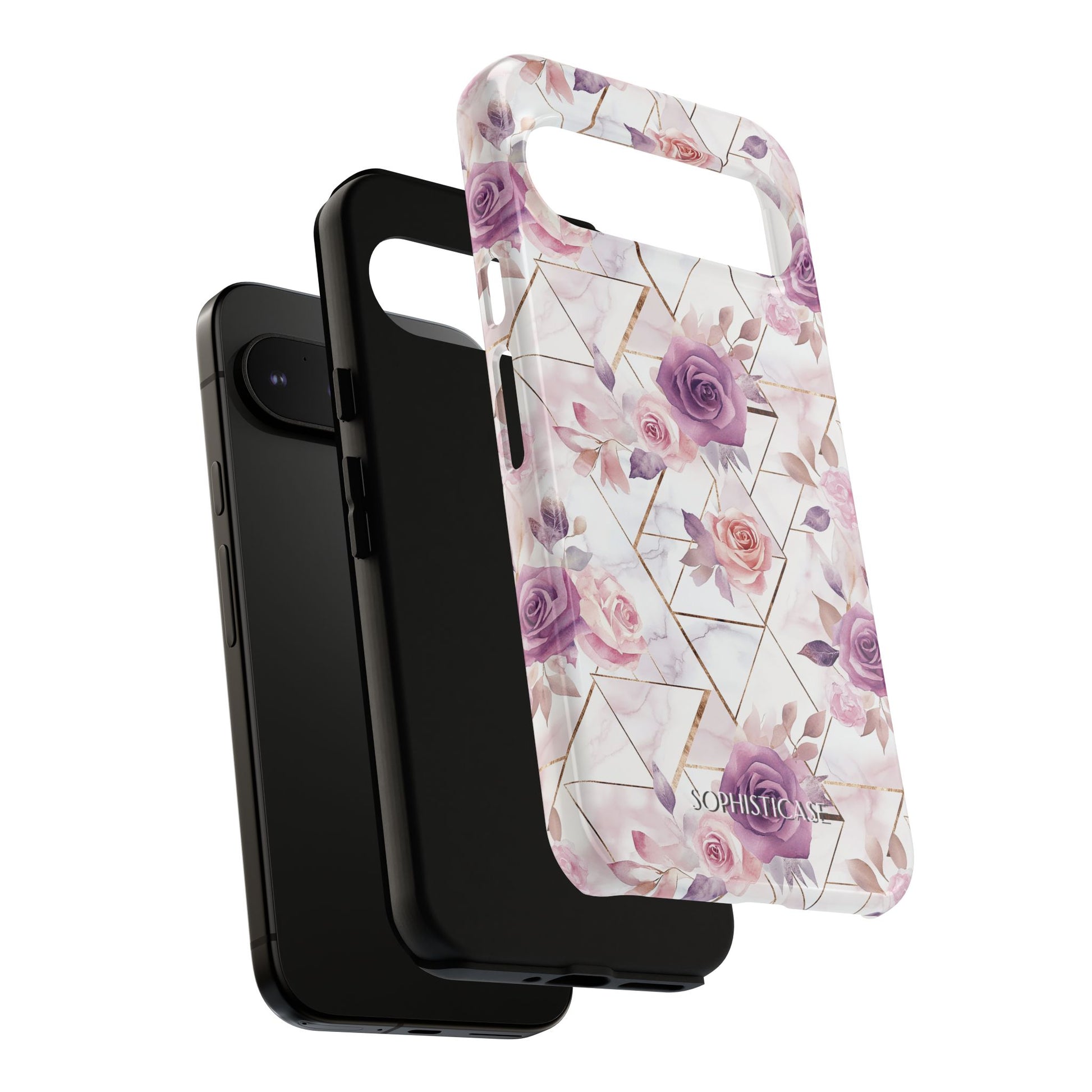 For the woman that turns every day into an entrance. Royal floral blooms and metallic look geometry give a refined, regal edge. Choose your mood and match your accessories: soft blush and mauve roses over marble geometric designs, or midnight navy blooms with shades of gold lattice. Its the statement case that works as hard as you do✨