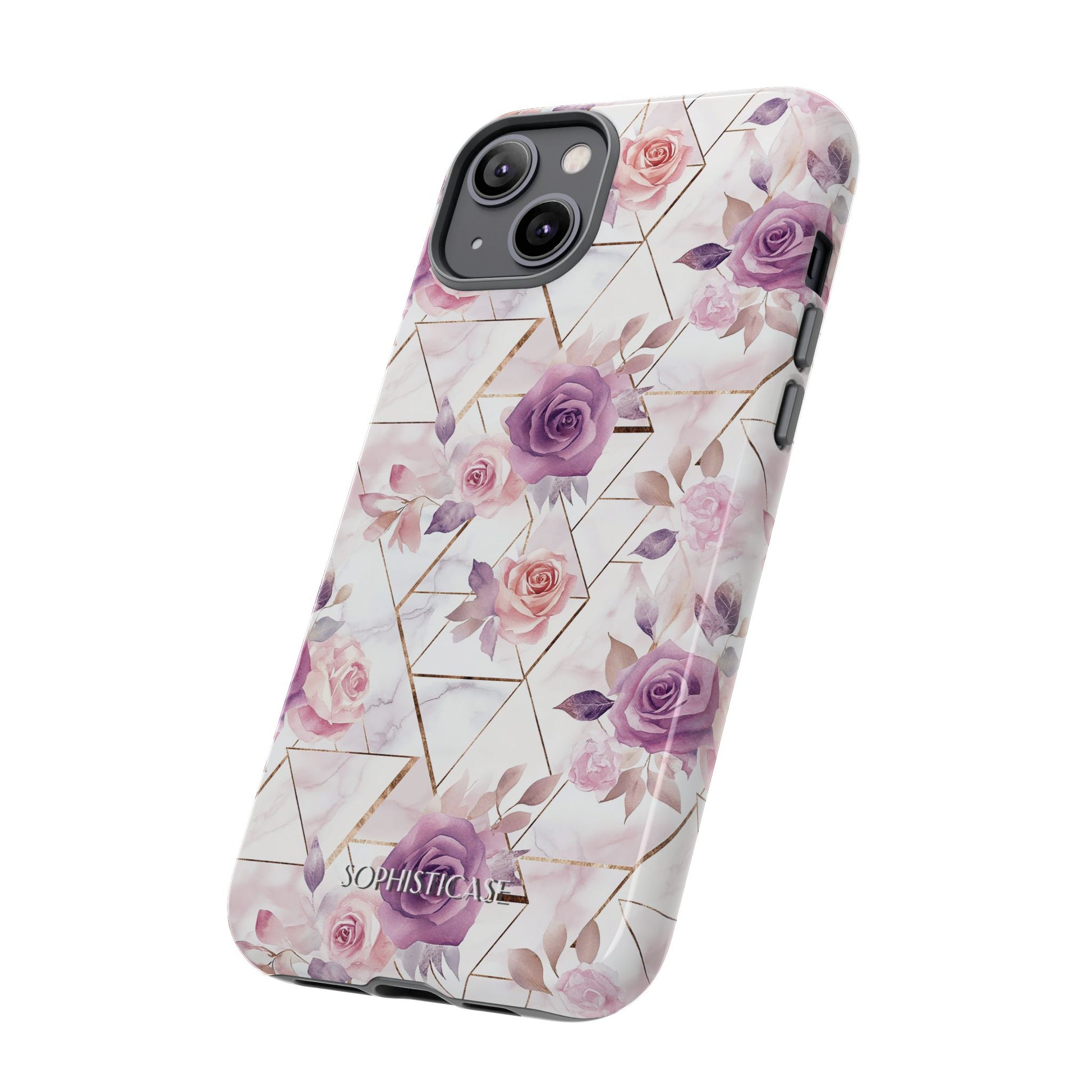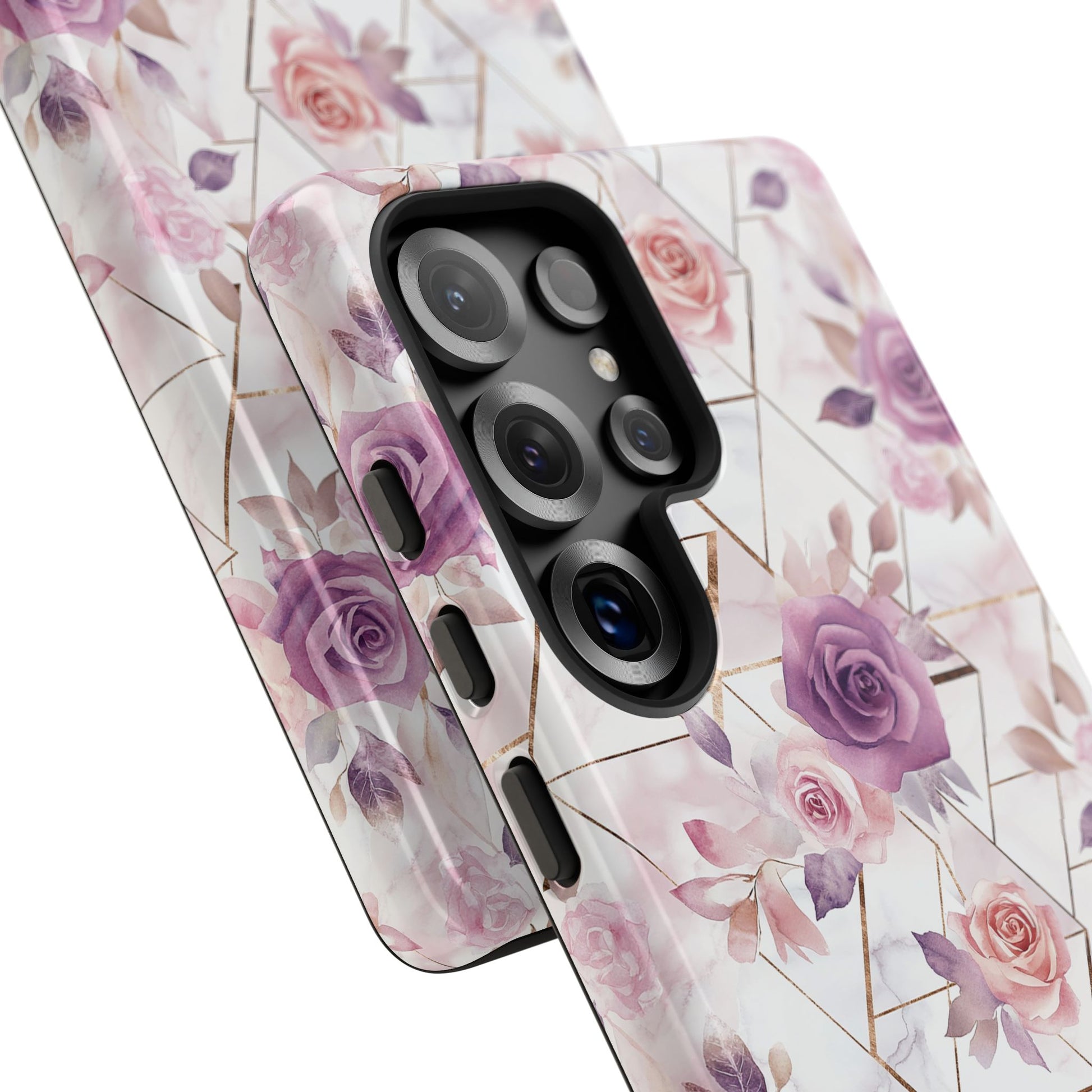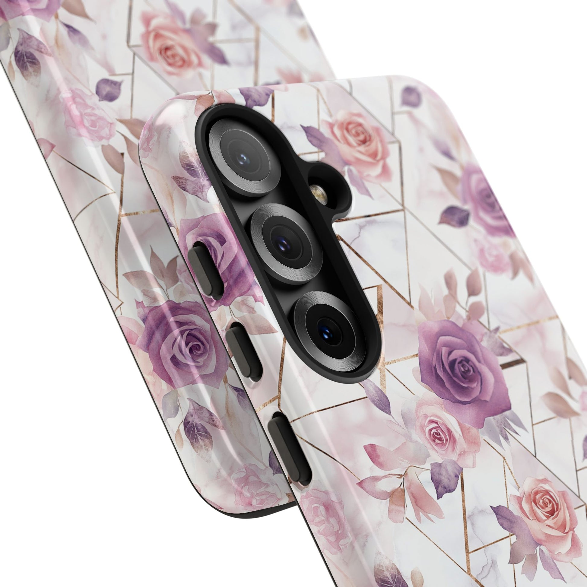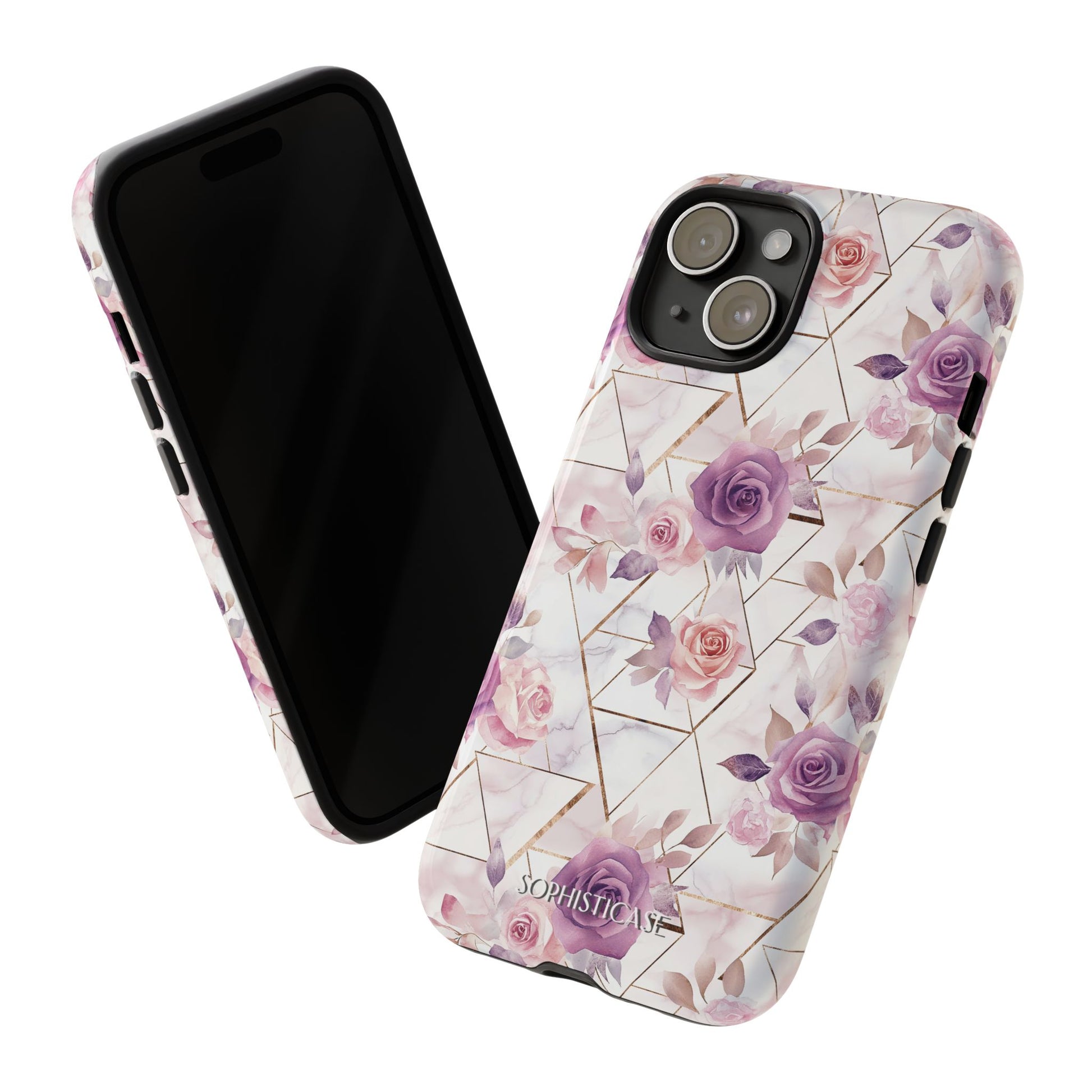 For the woman that turns every day into an entrance. Royal floral blooms and metallic look geometry give a refined, regal edge. Choose your mood and match your accessories: soft blush and mauve roses over marble geometric designs, or midnight navy blooms with shades of gold lattice. Its the statement case that works as hard as you do✨